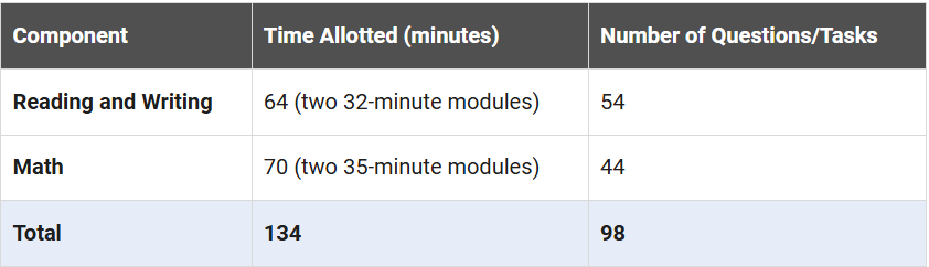 Each section is divided into 2 equal length modules, and there is a 10-minute break between the Reading and Writing section and the Math section. The first module of each section contains a broad mix of easy, medium, and hard questions. Based on how you perform on the first module, the second module of questions will either be more difficult or less difficult.
